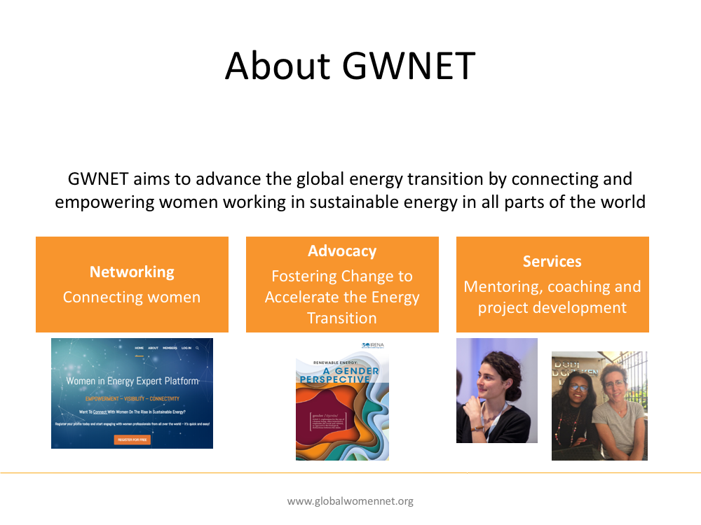 GWNET, an international NGO, created the Women in Energy Expert Platform, to support women in the energy sector. With some 1,000 registrations from 90 countries, GWNET runs structured mentoring programs and knowledge-transfer programs for their members. If you are a woman active in sustainable energy and would like to join our network of like-minded women, consider joining us!
